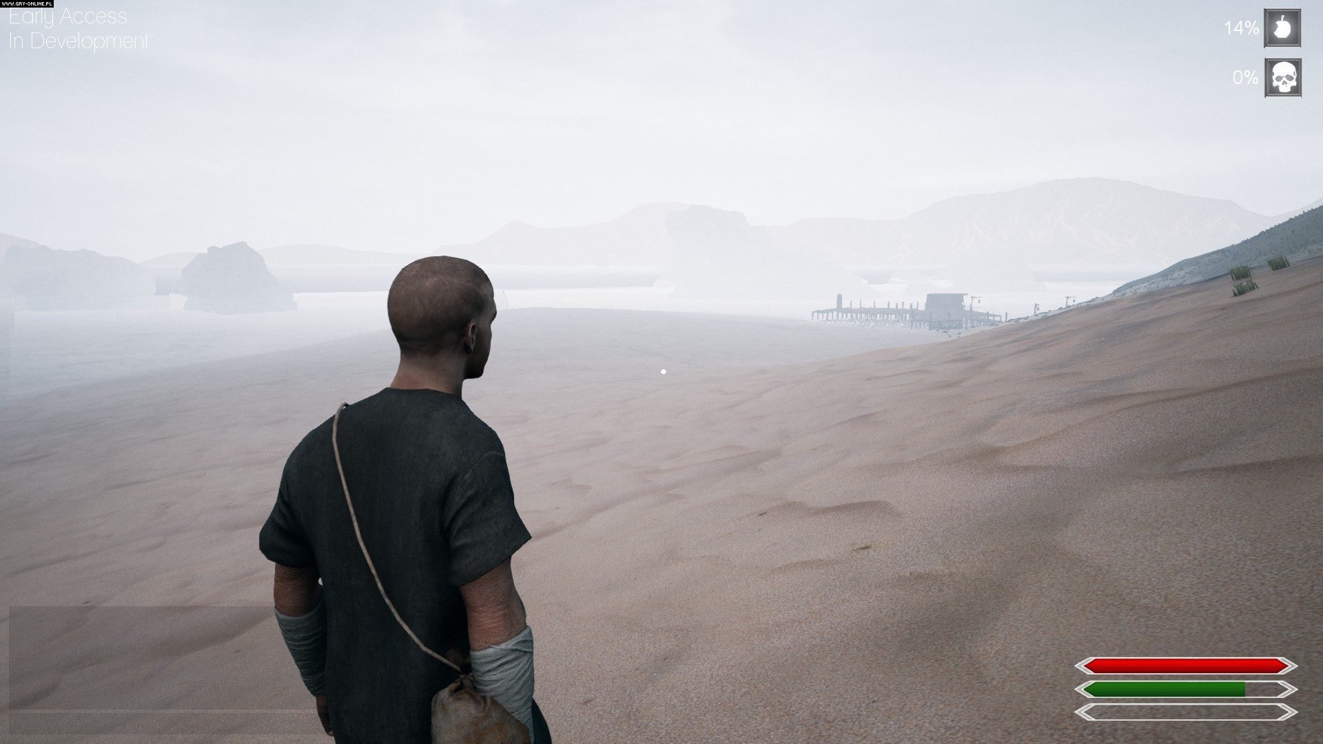 Być może zakończenie poprzedniego akapitu nie wygląda dla produkcji połączonych sił deweloperskich Syrin Studios i Small Impact Games najlepiej, ale pamiętajcie, że niniejszy tekst dotyczy bardzo wczesnej wersji kodu, a więc pozbawionej większości funkcjonalności, zabugowanej i – delikatnie rzecz ujmując – brzydkiej jak noc listopadowa. Choć na pierwsze dwa mankamenty należy na obecnym etapie przymknąć oko, niepokoi trochę jakość oprawy graficznej korzystającej z dobrodziejstw czwartej iteracji Unreal Engine’u. Korzystającej w sposób bardzo, ale to bardzo nieudolny. Niewielki zasięg widzenia, paskudna roślinność, grubo ciosane budowle z kamienia i woda, która wygląda tak źle, że uznana zostałaby za brzydką chyba jeszcze w czasach sprzed ery graficznych akceleratorów Voodoo. Dodajmy do tego kiepskie modele sklonowanych postaci, animacje rodem z „parku sztywnych” i wszechogarniającą, powtarzalną pustkę. Dawno już nie widziałem czegoś tak fatalnie wykonanego, za co ktoś chciałby dostać pieniądze.