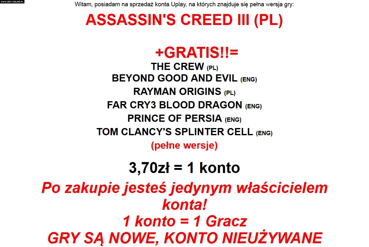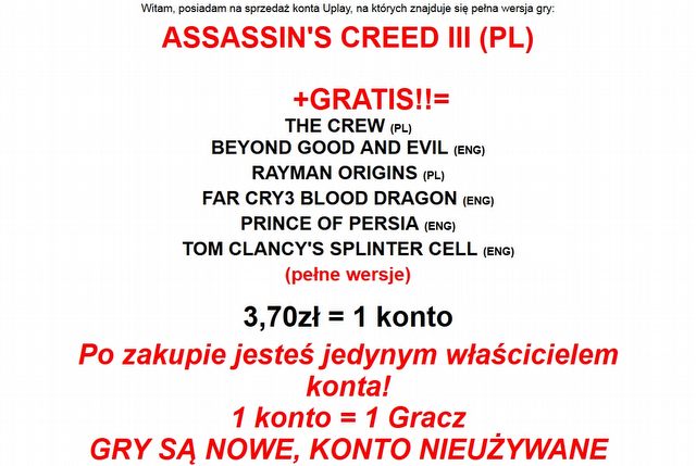 Istnieją też przypadki oparte na żerowaniu na niewiedzy klienta i ofertach charytatywnych. Mowa oczywiście o sprzedawaniu kont z grami pochodzącymi z wszelkiego rodzaju akcji rozdawniczych, np. z okazji trzydziestolecia Ubisoftu, kiedy to udostępniono za darmo m.in. Assassin’s Creed III i The Crew, czy choćby pojedynczych gratisów na Steamie – całkiem niedawno do użytkowników platformy firmy Valve trafiło 5 milionów kopii PayDay 2. Dla drobnych cwaniaczków są to świetne okazje do łatwego zarobku, gdyż pozyskanie towaru kosztuje ich tylko czas. Takie aukcje kuszą nieświadomych graczy korzystną ceną i wyłącznością dostępu do konta.
