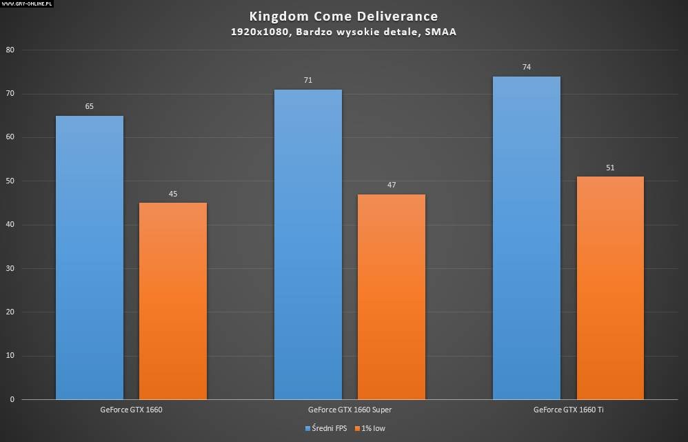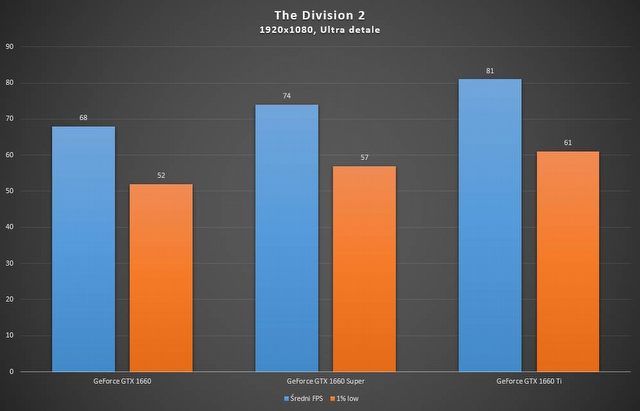 Różnica pomiędzy GTX 1660 a 1660 Ti wynosi 14%, co daje w tym przypadku poprawę wydajności o 10 fps. Zwycięstwo odnosi tutaj jednak GTX 1660 Super. Ten model bowiem generuje tylko 2% mniej fps niż 1660 Ti, ale jest przy tym o 250 złotych tańszy.