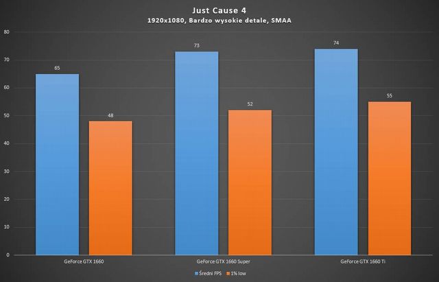 Żadna z prezentowanych kart nie przekroczyła w grze Just Cause 4 magicznej bariery 60 fps na maksymalnych detalach w rozdzielczości 1920x1080. Oczywiście mowa tutaj o stałej liczbie wyświetlanych klatek na sekundę. Są momenty w grze, kiedy płynność spada poniżej tej granicy (1% low na wykresie). Najlepiej radzi sobie oczywiście GeForce GTX 1660 Ti, ale różnica pomiędzy nim a GTX 1660 Super wynosi zaledwie kilka fps. Biorąc pod uwagę również cenę (1050 vs 1300 złotych), jest to bardzo słaby wynik.