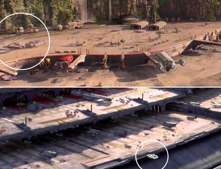 Zanim najsłynniejszy statek w galaktyce pojawił się w chronologicznie czwartych Gwiezdnych wojnach, zaliczył skromny, ukryty występ w trylogii wyreżyserowanej przez George’a Lucasa. Corelliański statek z serii YT-1300, w liczbie sztuk 3, pojawia się z boku kadru w Ataku klonów, gdy widzimy kosmiczny port na planecie Naboo. Żadna z tych maszyn na pewno nie jest Sokołem. Natomiast w Zemście Sithów, tuż po awaryjnym lądowaniu we wstępie, widać kolejny kosmiczny port, do którego właśnie wlatuje pojazd o charakterystycznym kształcie. Jest sam, więc uznaję, że to Millenium Falcon we własnej „osobie”.
