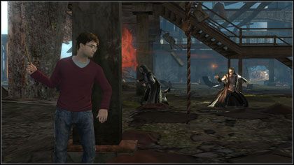 A także akcja i jeszcze raz akcja, bowiem Harry Potter i Insygnia Śmierci ma być najprawdziwszym shooterem z perspektywą z trzeciej osoby. Owszem, zamiast tradycyjnej broni w użyciu będzie jedynie magiczna różdżka, ale rzucane przez nią zaklęcia w dużej mierze zadziałają analogicznie do strzałów z pistoletu, karabinu maszynowego czy bazooki, choć nie spowodują niczyjego zgonu, przynajmniej nie w takim rozumieniu, do jakiego przyzwyczaiły nas inne gry. Poziom, który miałem okazję obejrzeć, a następnie w niego zagrać, znajdował się w opuszczonej fabryce pełnej teleportujących się w kłębach dymu Śmierciożerców. Pokonany przeciwnik znika w identyczny sposób. Autorzy gry są przekonani, że epatowanie trupami w takim tytule nie jest konieczne i że to rozwiązanie w zupełności wystarczy. Niestety, nie miałem okazji zobaczyć, jak Harry radzi sobie z potworami w rodzaju pająków czy trolli, czy nawet smoków, które również pojawią się w grze jako oponenci. W przypadku dużej utraty punktów życia ekran robi się czarno-biały oraz zmniejsza się pole widzenia z powodu zaciemnienia jego narożników.