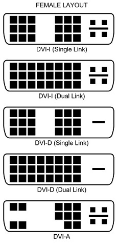 Jest to schemat gniazd żeńskich pochodzący z popularnej Wikipedii. Analizując go, można zauważyć, że na wcześniejszym zdjęciu z przykładowym wtykiem DVI występuje męskie DVI-D w wariancie Dual Link, a więc jedna z wersji oferujących najbardziej rozbudowane możliwości.
