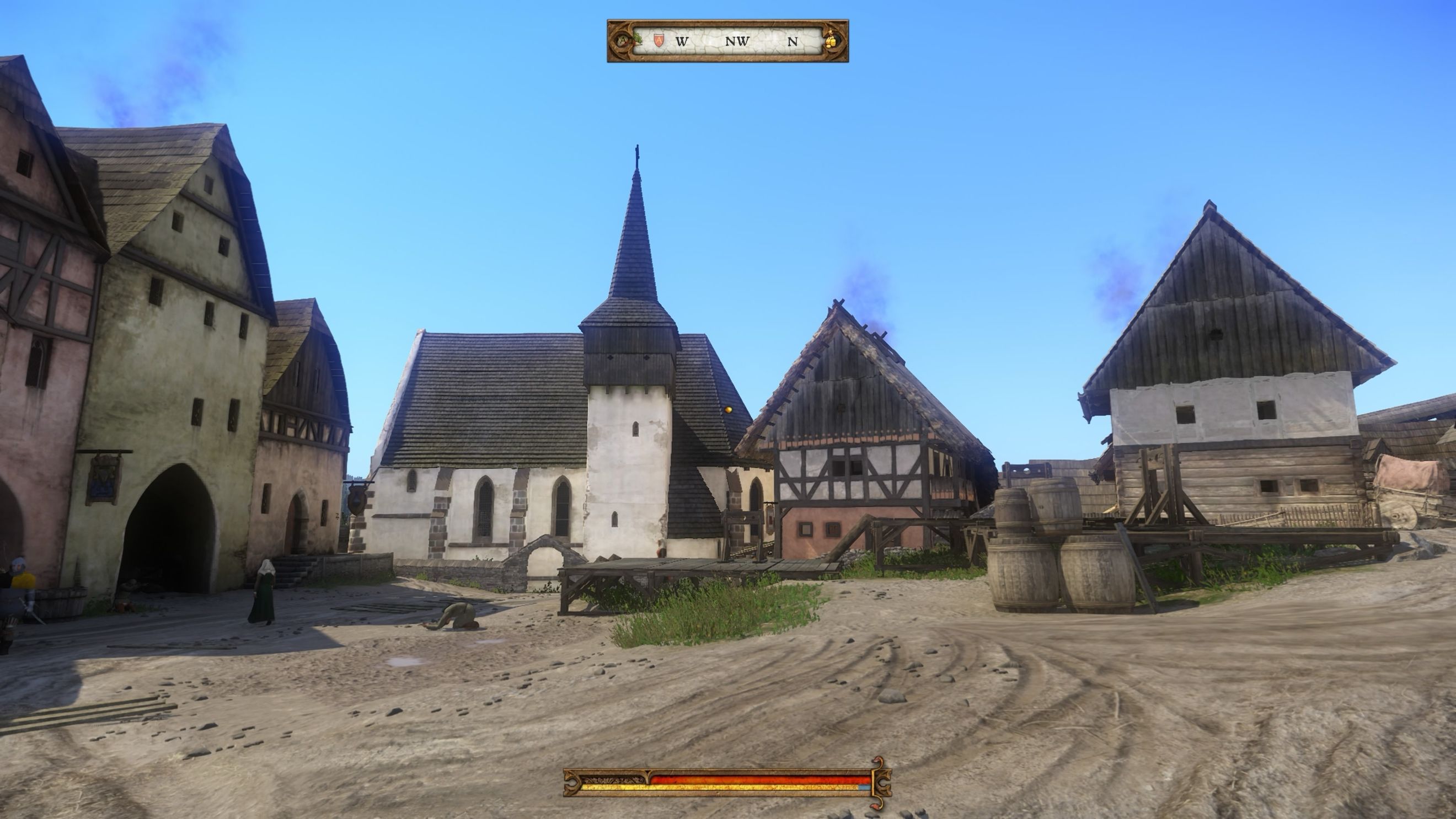 Płynność jest tak samo dobra również gdy biegamy po Ratajach. Nie zauważyłem żadnych doczytujących się obiektów czy pop-upów tekstur. Te ostatnie zdarzają się, ale tylko zaraz po wczytaniu save’a. Tu, mam wrażenie, akurat niewiele się zmieniło – loading i wypełniające się kółko na bramie zamku w dolnym rogu nadal będą nam często się pokazywać – taki urok tego silnika.