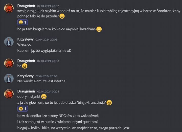 K.L.: O właśnie, ta detektywistyczna warstwa jest trochę śmiechu warta. Mało zadań dobrze z niej korzysta, dając prawdziwą swobodę – perełką okazuje się tu quest ze zwolnieniem robotników przez pana Niemca. Żałuję, że nie było tego więcej, i żałuję, że w ten świat nie można wejść mocniej. Broken Roads – przy całej antypatii do tego, niestety, potworka, kazało mi szukać książek i pilnować kurnika. Nudne w opór, ale czułem, że coś robię.