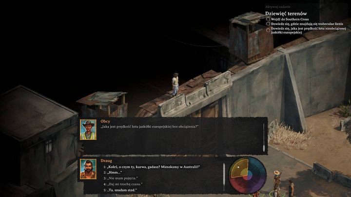 K.L.: Ach, te słynne pytania, by wejść do kluczowej dla nas lokacji... W dodatku wracasz z odpowiedziami, a wartownik przy bramie nagle zmienia kwestie – i czujesz się jak student, który wyuczył się testów z zeszłych lat, a egzaminator postanowił przygotować kompletnie nowy zestaw. Z tym, że analogia ta kończy się właśnie w tym momencie – w rzeczywistości uczelnianej nie zdajesz i szykujesz się do poprawki, a w Broken Roads następują zupełnie nielogiczne czary-mary (czyt. błąd), bo odpowiedzi już dobrze znasz. Następnie, eksplorując świat gry i wchodząc w interakcje z postaciami, dalej możesz pytać o nowo poruszone kwestie – mimo że przecież już popisałeś się wiedzą na ich temat.