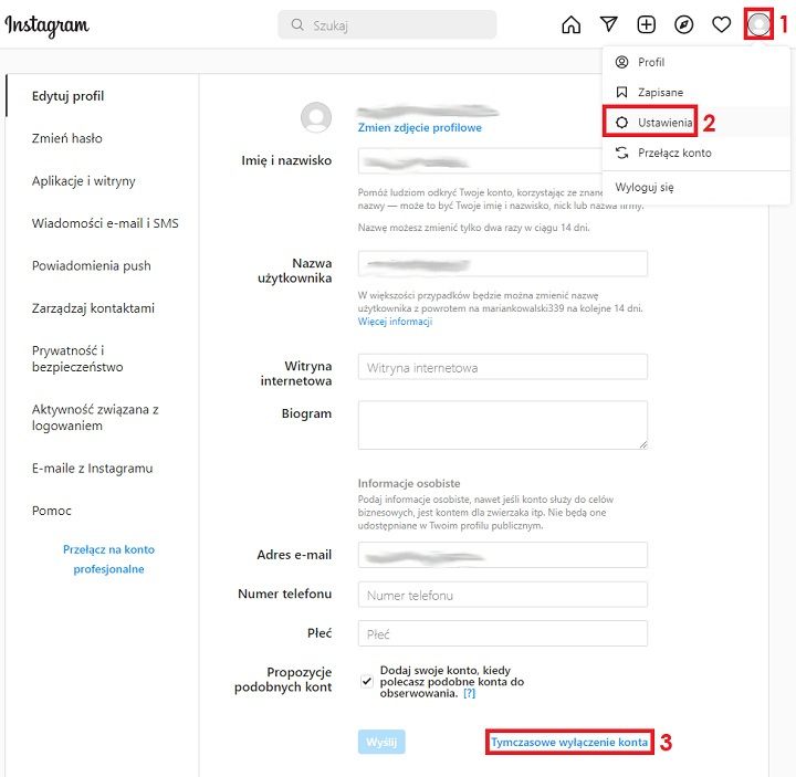 Żeby przejść do właściwego okna, wystarczy wejść na Instagram, kliknąć swoje zdjęcie profilowe (1 na fot.) na pasku w prawej górnej części strony, z rozwiniętego menu wybrać Ustawienia (2) i odnaleźć opcję Tymczasowe wyłączenie konta (3) na nowo otwartej stronie. Wtedy naszym oczom ukaże się taki mini formularz do wypełnienia i zaakceptowania: