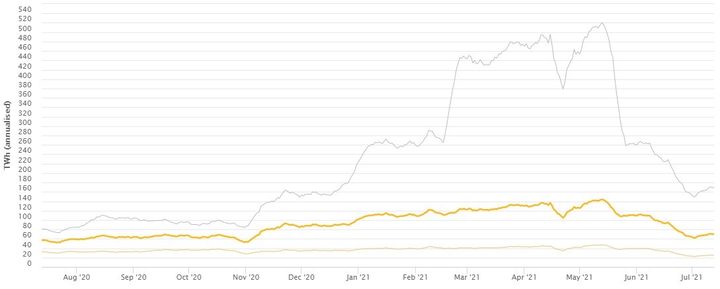 Nie ma prostej odpowiedzi na to pytanie, ale w skrócie można powiedzieć, że sporo. Jeszcze zanim Chiny na dobre wypowiedziały wojnę kryptowalutom, globalne zużycie energii na wydobycie BTC było tak wysokie, że według Cambridge Centre for Alternative Finance w skali roku dałoby ponad 141 TWh. Wynik ten zbliżał najpopularniejszą kryptowalutę do Polski, zużywającej rocznie około 152 TWh. Na wykresie widoczny jest gwałtowny spadek zużycia w maju 2021 roku, będący skutkiem zamknięcia wielu chińskich kopalni.
