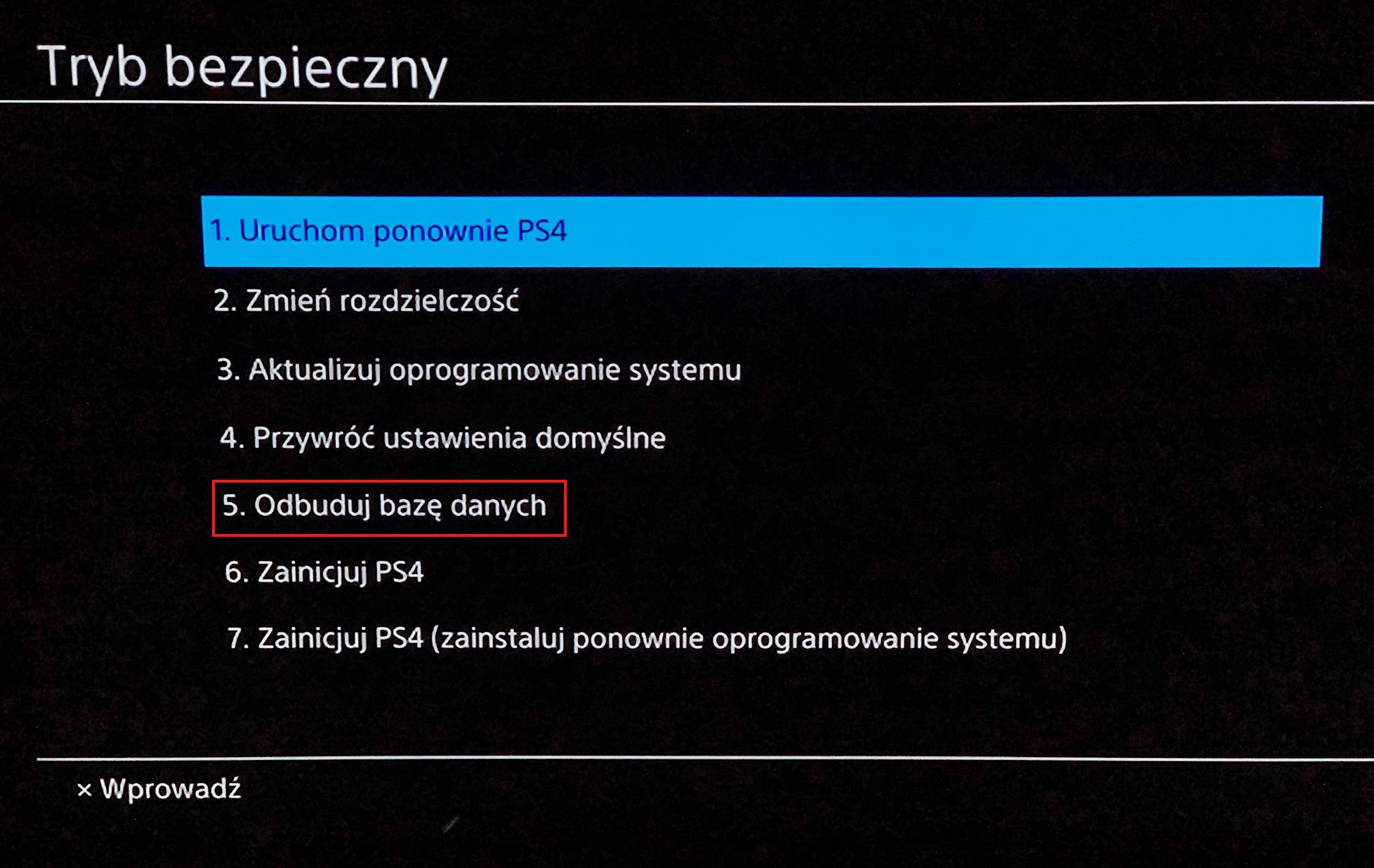 PlayStation uruchomi się w trybie bezpiecznym, w którym to interesuje nas opcja kryjąca się pod numerem 5 – „Odbuduj bazę danych”.