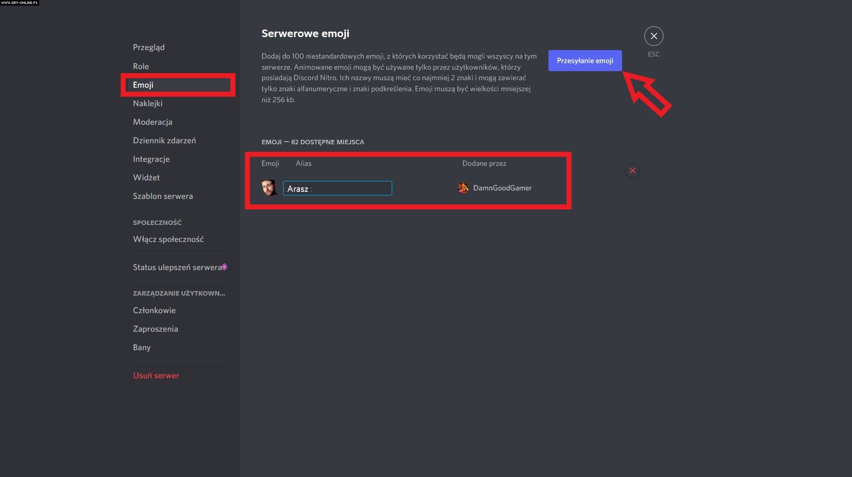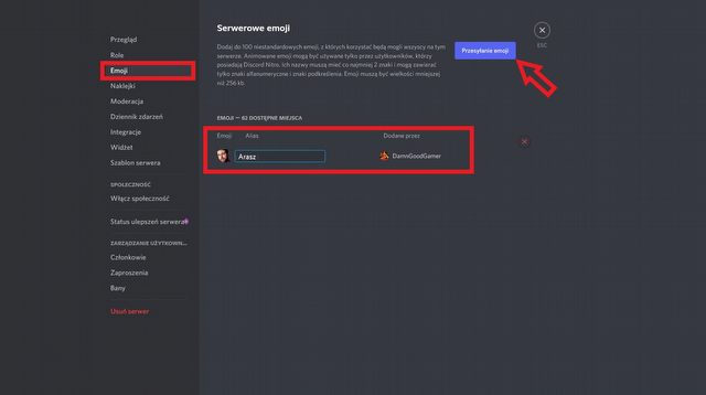 Użycie zapisanych obrazów jest dziecinnie proste, wystarczy wejść w odpowiednią zakładkę, wybrać emotikonę, którą chcesz wstawić na swój serwer, a następnie ją nazwać, by łatwiej używało się jej w trakcie rozmowy, zapisując ją słownie (np. :Arasz: ).