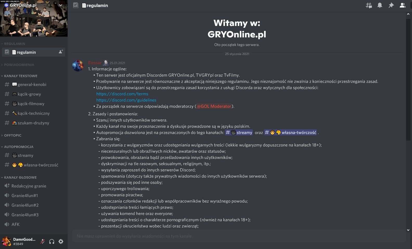 Dobrym pomysłem będzie zapoznanie się z regulaminem każdego serwera, do którego dołączysz, ponieważ zwykle różni się on zależnie od społeczności, a jego złamanie może skończyć się niepotrzebnym banem. Zwykle zostaniesz do niego przekierowany już na samym początku po dołączeniu, a w przypadku dużych serwerów, możliwe że będziesz musiał zareagować klikając w odpowiedni emotikon, by zostać dopuszczonym do czytania innych wiadomości na serwerze.