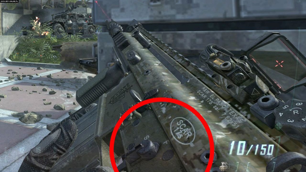 Szczytem lenistwa grafików jest Call of Duty: Black Ops II, gdzie karabin wojskowy SCAR-H (tak też nazwany w grze), posiada wyraźne logo z napisem SCAR-S (wersja cywilna, z ogniem pojedynczym). Zarówno w Call of Duty: Modern Warfare 3 jak i Battlefield 3 - pistolet maszynowy UMP przedstawiony jest z dużym napisem „Warning” na korpusie, zachęcającym do przeczytania instrukcji obsługi. W większości przypadków jednak cywilną wersję rozpoznamy po dwustopniowym selektorze ognia: "zabezpieczony" i "ogień pojedynczy". Ten mały przełącznik sprawia zresztą grafikom o wiele więcej kłopotów. W wielu grach jego ustawienie jest dość przypadkowe i nie ma żadnego związku z tym, jak strzela gracz, czy jakie są możliwości karabinu.