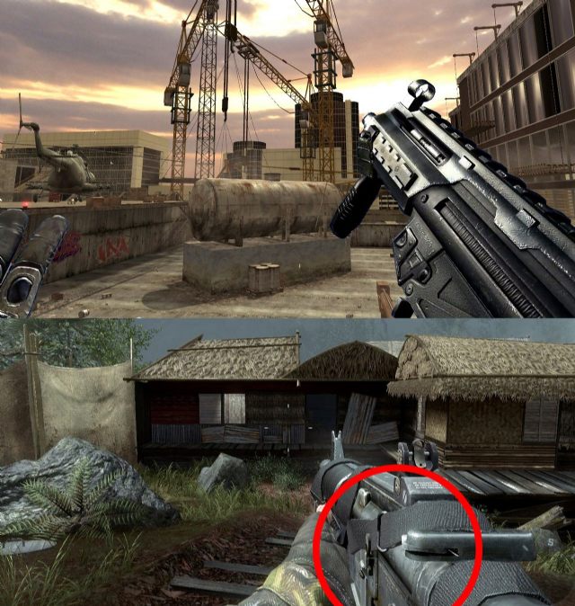 Seria Call of Duty darzy szczególnymi względami pistolet MP5K, bo ta podróż w czasie nie jest odosobnionym przypadkiem dość swobodnego podejścia do tego modelu broni. W Modern Warfare 2 - MP5K jest odwzorowany na podstawie airsoftowej repliki na plastikowe kulki. Zestaw szyn montażowych, obejmujących lufę i korpus nie istnieje w rzeczywistości i jest wynalazkiem tajwańskiego producenta zabawek, firmy ICS. Inna mała wpadka grafików, tym razem w Call of Duty: Black Ops, to karabinek Colt Commando i pas do noszenia owinięty wokół broni tak, że blokuje zwalniacz zamka.