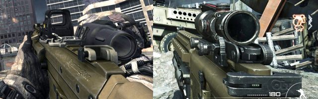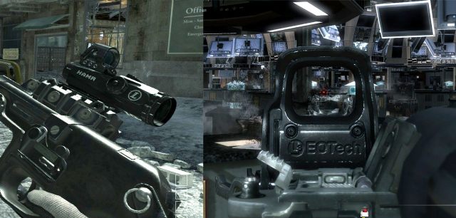 Sama animacja przeładowania np. MSR również wydaje się wręcz demonstrować przed nami nazwę firmy. Ogromne i dodatkowe logo widać też na paru celownikach optycznych, przy których nie ma wątpliwości, że producentem jest Leupold, a karabin CM901 posiada olbrzymi znak Colt na rączce przeładowania. W prawdziwym egzemplarzu go tam nie ma, ale dzięki temu gracz widzi nazwę częściej i wyraźniej, niż liczbę pozostałych nabojów w magazynku. Gra bombarduje nas też symbolem producenta celowników EOTech, choć w tym przypadku rozmieszczenie napisów zgadza się z oryginalnym produktem.