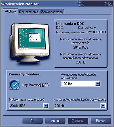 Niestety, aktualne systemy operacyjne z rodziny Windows (np. XP) błędnie odczytują ustawienia monitora. Często zdarza się, że podczas grania lub oglądania filmów częstotliwość odświeżania spada do minimalnego pułapu 60 Hz (60 to liczba odświeżania punktów na ekranie w ciągu sekundy, punkty gasną szybko i dlatego widać migotanie), co powoduje, że siedzenie przed monitorem staje się męczące i nieprzyjemne. Oto kilka rad, jak sobie z tym fantem poradzić.