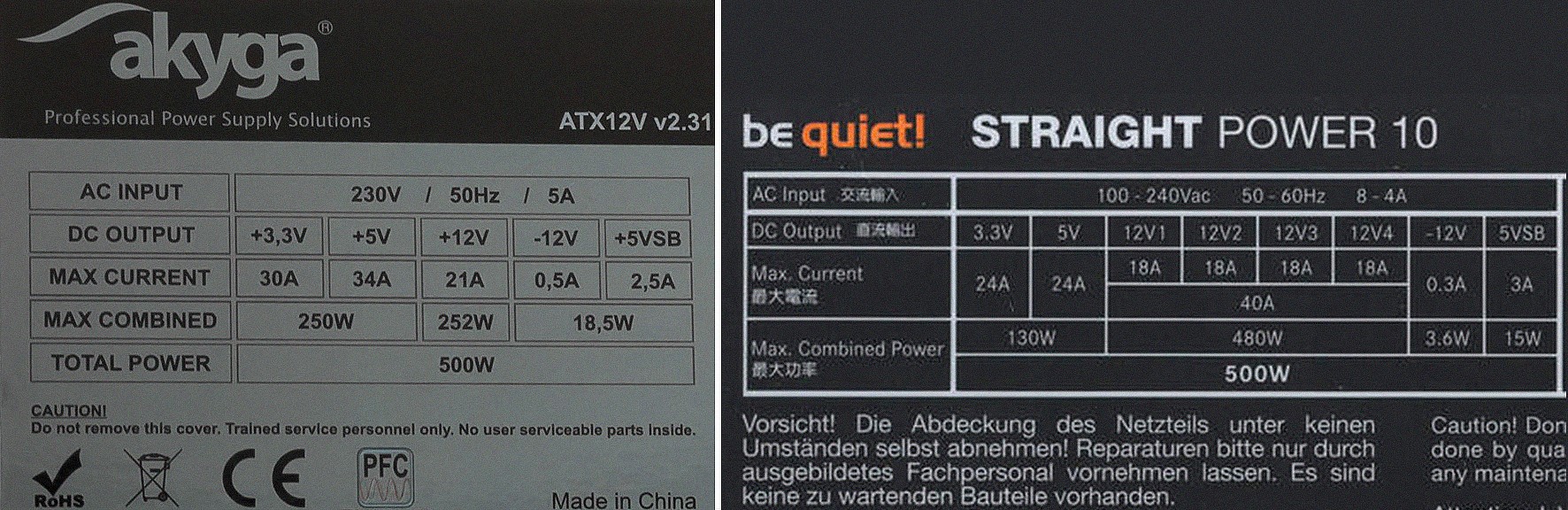Spójrzcie na porównanie obu zasilaczy powyżej. Różnicę zauważycie natychmiast. 12-voltowa linia budżetowej Akygi zapewnia zaledwie 252 W (maksymalne natężenie prądu: 21 amperów). 12-voltowa linia zasilacza be quiet! to 480 W (maksymalne natężenie prądu: 40 amperów). Dla perspektywy: karta GeForce GTX 970 – pod obciążeniem – pobiera 290 W. Wymaga też minimalnego natężenia wynoszącego 28 amperów. Efekt: Akyga nie zasiliłaby tej karty graficznej. Wyposażony w ten zasilacz sprzęt mógłby nawet w ogóle się nie włączyć. Z kolei dla zasilacza marki be quiet! takie obciążenie to tylko dwie trzecie energii, którą przy tym napięciu może rozdysponować.