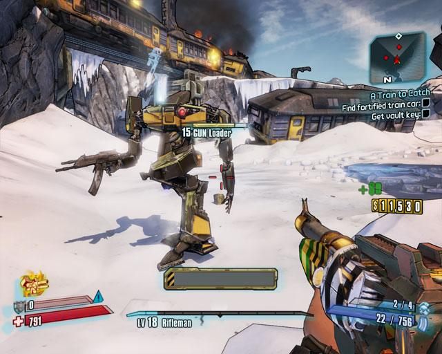 Roboty to najczęściej spotykani przeciwnicy na Pandorze i nie powinno to nikogo dziwić, wszak stanowią one trzon armii Hyperionu, korporacji zarządzanej przez Przystojnego Janka. Loader to bez wątpienia najliczniej reprezentowana jednostka tego typu, ale nawet i w jej szeregach rozróżnia się kilka rodzajów tych maszyn, w zależności od zainstalowanego uzbrojenia. Na powyższym obrazku widnieje BUL, Transformers zmieniający się w spychacz i taranujący swoich rywali. Niżej natomiast możecie obejrzeć bardziej klasycznego GUN-a, czyli robota uzbrojonego w tradycyjną broń palną.