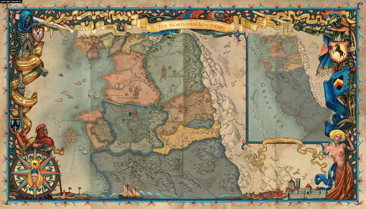 Mapa polityczna z Wiedźmina 2. Przesuńcie wyszarzony obszar – prezentujący włości Nilfgaardu – na północ do linii rzeki Pontar, a otrzymacie mniej więcej aktualną sytuację na świecie.