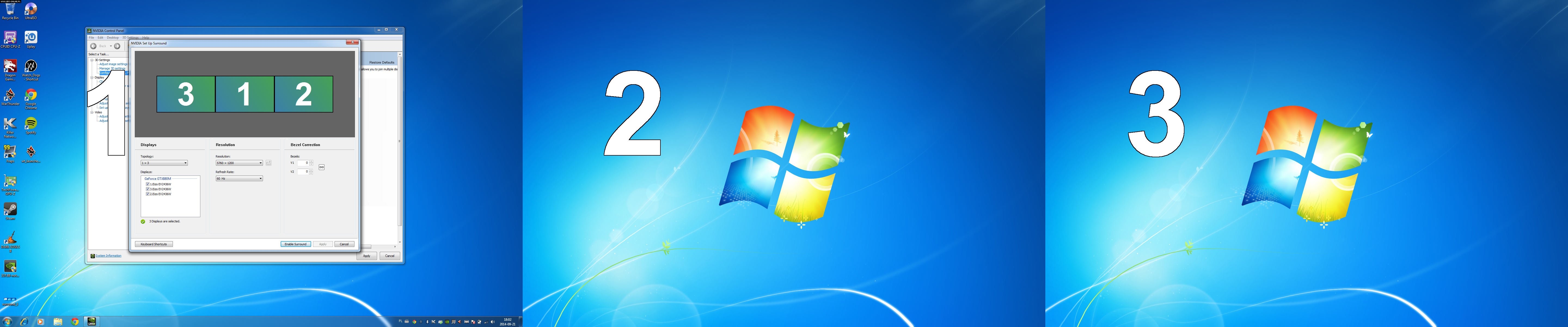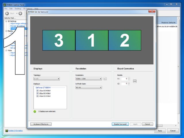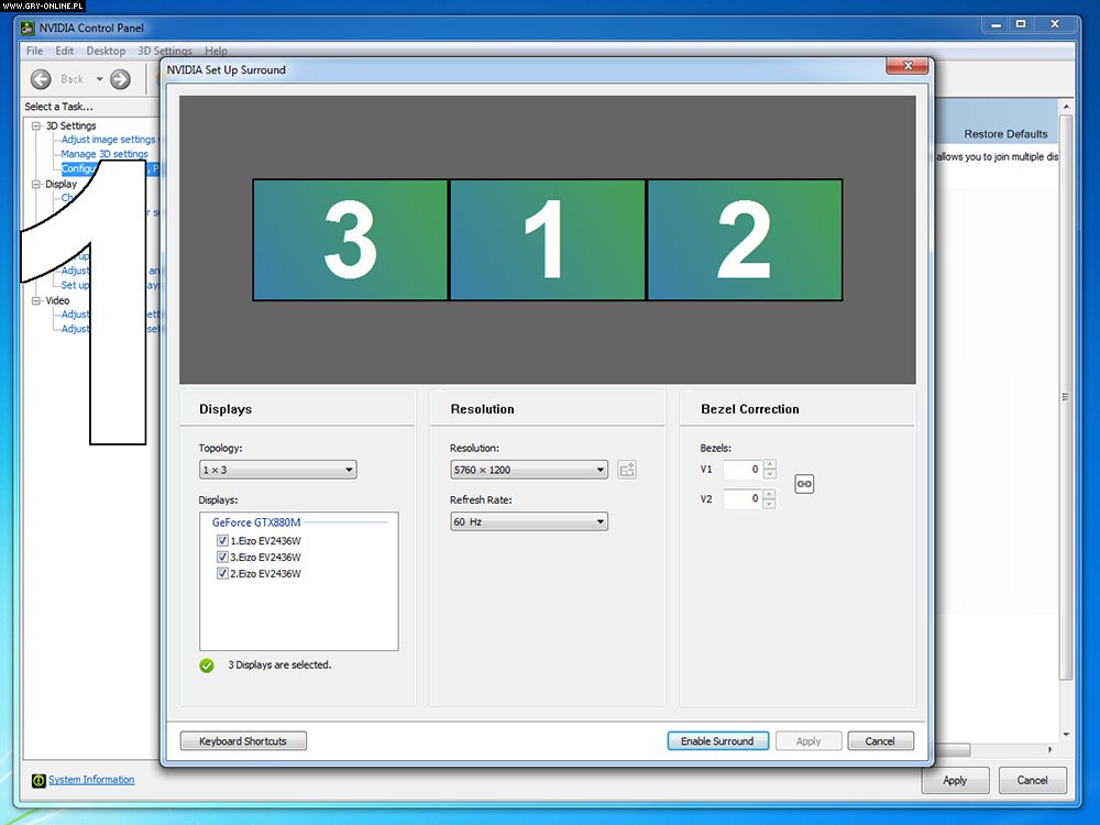 W kolejnym oknie użytkownik proszony jest o wskazanie pożądanej konfiguracji. Wybierać można pomiędzy opcjami 1x3 (trzy wyświetlacze jeden nad drugim) lub 3x1 (trzy wyświetlacze obok siebie). Aby uzyskać przewagę nad innymi graczami na polu walki, trzeba wybrać opcję drugą, która zapewni znacznie szersze niż standardowe pole widzenia. Po zatwierdzeniu w menu sterowników pojawi się nowa rozdzielczość: rozdzielczość Surround, która w przypadku trzech monitorów Eizo EV2436W wyniesie 5760x1200.