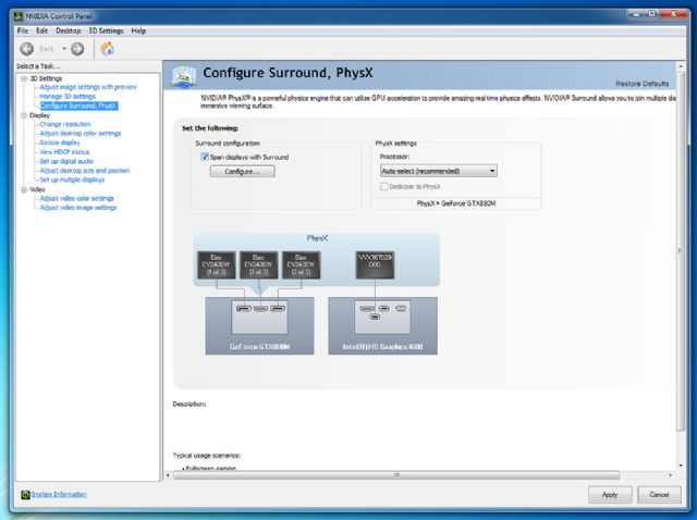 - Wyświetlacze, które przeznaczone są do Matrix Display muszą mieć identyczną rozdzielczość natywną, w innym przypadku stworzenie jednej dużej powierzchni ekranu nie powiedzie się. Panel kontrolny do sterowników Nvidia GeForce blokuje poszczególne opcje już na etapie wykrywania podłączonych monitorów. My zaopatrzyliśmy się w trzy identyczne monitory Eizo EV2436W o rozdzielczości natywnej 1920x1200.