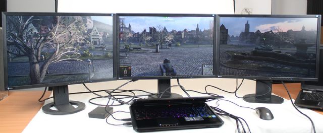 Wyświetlacze podłączamy z tyłu laptopa do dwóch wyjść DisplayPort oraz do jednego wyjścia HDMI. Po podłączeniu zasilania wyświetlacze zostaną automatycznie wykryte w panelu sterownika Nvidia, ale trzeba będzie je skonfigurować.