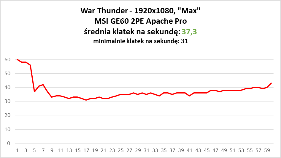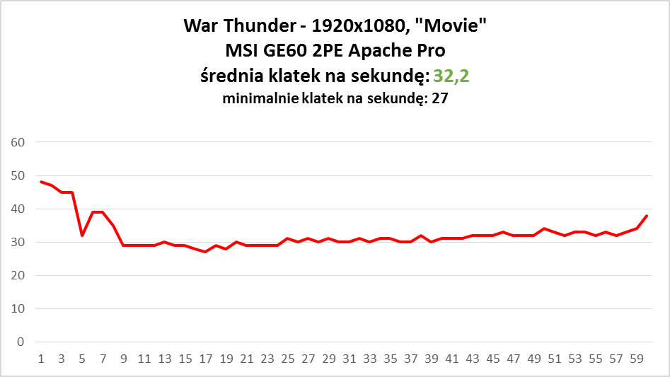 Dla MSI GE60 ustawienia typu “Movie” czy „Max” są już ciężkie do przełknięcia. W tym pierwszym trybie stale widać 30 klatek na sekundę i jest to jednak trochę za mało do komfortowej gry w War Thunder. Na ustawieniach „oczko niżej” niewiele się zmienia, bo choć kilka klatek na sekundę przybyło, to wciąż można spodziewać się nie więcej niż 35-40 klatek na sekundę.