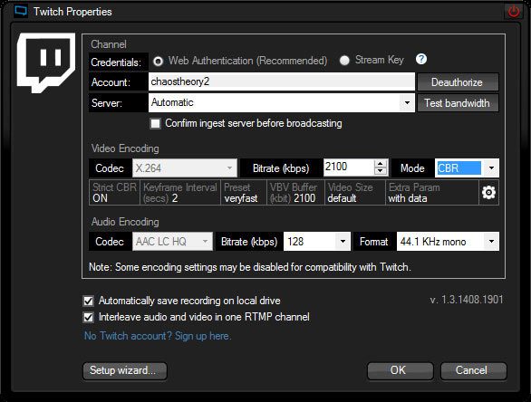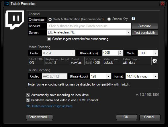 Wyświetli się kolejne okno z właściwościami. Najlepiej zacząć od naciśnięcia przycisku „Authorize”. Kliknięcie w niego otworzy kolejne małe okienko z logowaniem do serwisu Twitch.tv. Jeśli mamy tam konto – sprawa załatwiona i po prostu wpisujemy dane logowania. Jeśli nie, trzeba je najpierw założyć. Kiedy konto zostanie autoryzowane pora dowiedzieć się, na co stać nasz sprzęt oraz… łącze internetowe. W tym celu najlepiej kliknąć przycisk „Setup wizard”.