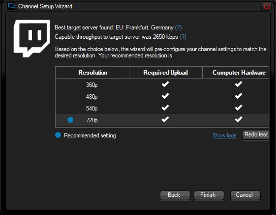W omawianym kreatorze program XSplit sprawdzi możliwości sprzętu pod kątem streamowania (wydajność procesora i karty graficznej), a także sprawdzi możliwości łącza internetowego. Ten pierwszy sprawdzian każdy z testowanych przez nas notebooków gamingowych MSI przeszedł poprawnie. Druga część zależy tylko i wyłącznie od połączenia internetowego - XSplit sprawdzi z jakim serwerem serwisu Twitch.tv najlepiej połączyć się z naszej lokalizacji oraz czy szybkość łącza (a konkretnie parametru wysyłania) jest wystarczająca. Jeśli mamy zamiar streamować gry z Polski to najprawdopodobniej najlepsze połączenie mamy z serwerem Twitcha umieszczonym we Frankfurcie, za naszą zachodnią granicą.