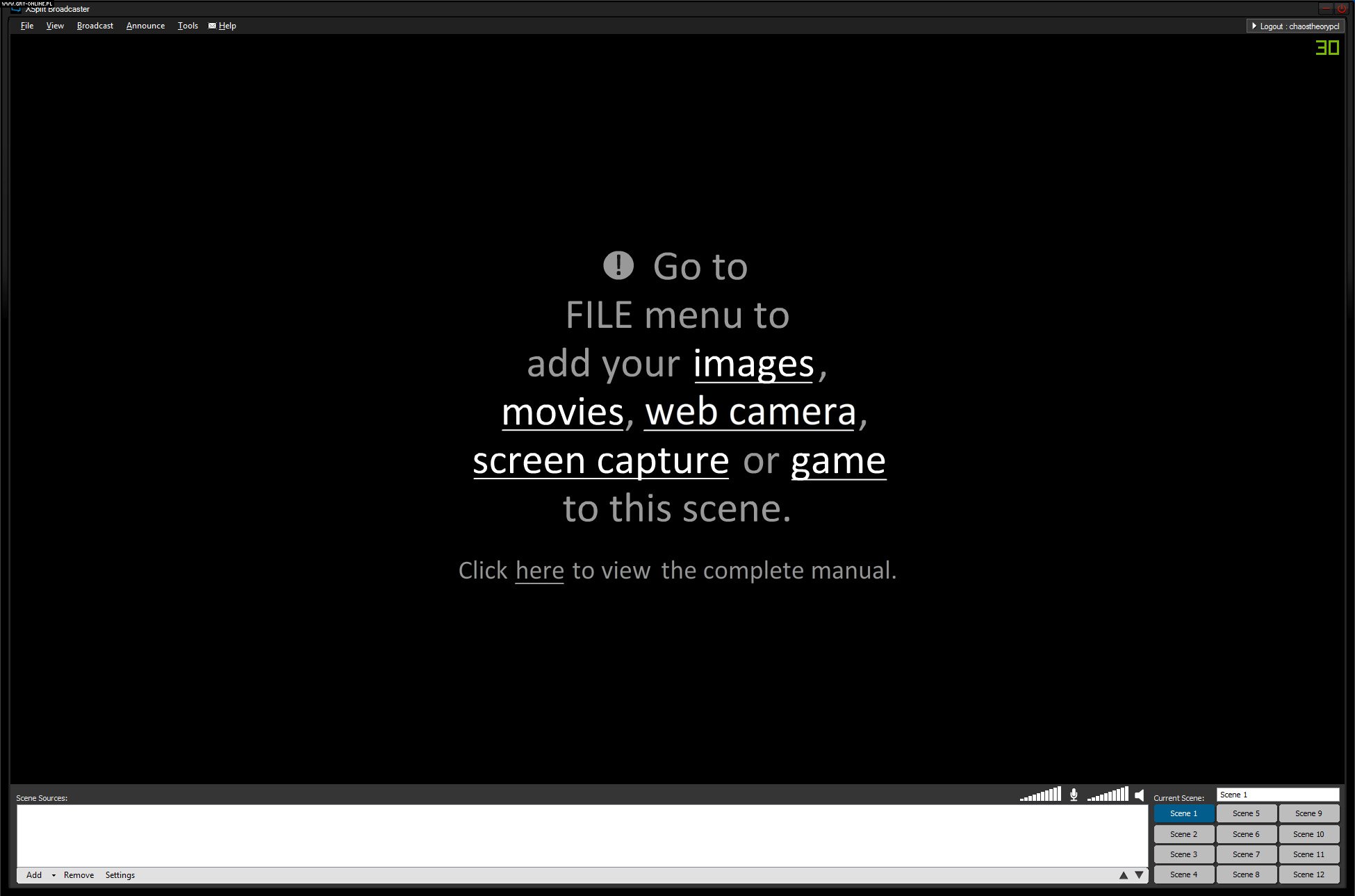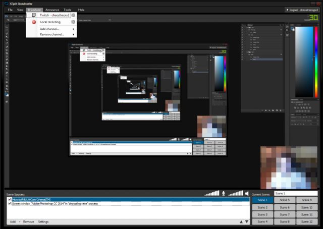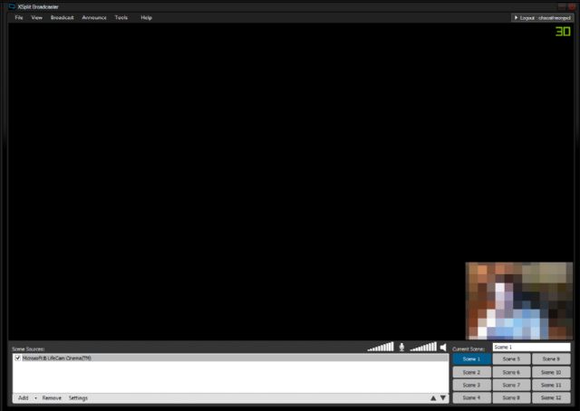 Zaraz po zalogowaniu otworzy się pełne okno programu, w którym będziemy musieli na początku skorzystać ze znajdującego się w lewym górnym rogu menu. Pierwsza i podstawowa sprawa to autoryzacja streamingu do serwisu Twitch w omawianym programie. W innym wypadku nasze ewentualne nagranie pozostanie na dysku twardym. Aby połączyć program XSplit z kontem na Twitch.tv należy odszukać w górnej części przycisk „Broadcast”, a następnie „Twitch”.