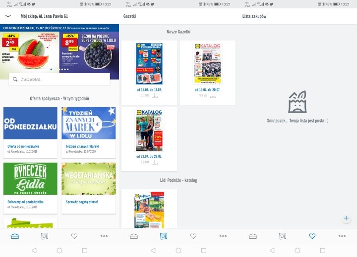 Lidl ma w swojej ofercie dwie aplikacje mobilne. Pierwsza z nich jest starszym programem i w zasadzie można ją określić jako bardziej rozbudowaną, interaktywną gazetkę promocyjną. Znajdziemy w niej informacje o aktualnych i nadchodzących promocjach. Dodając produkty do ulubionych można w prosty sposób stworzyć listę zakupów (a sklep poinformować o naszych preferencjach zakupowych). Aplikacja może nas też pokierować w drodze do najbliższego sklepu, dzięki aktywnemu przekierowaniu do map Google.