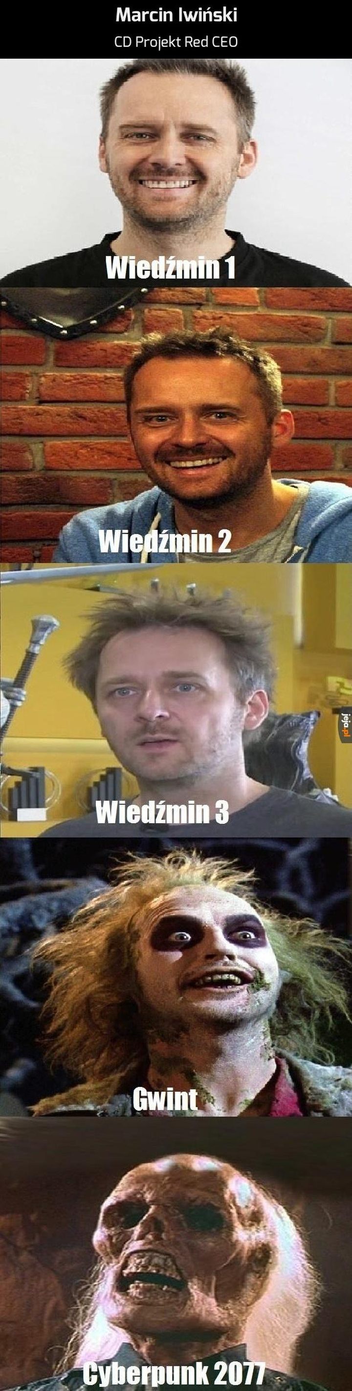 Memami oberwało się nie tylko Keanu, także Marcin Iwiński z CD Projektu stał się człowiekiem memem. Czy zdjęcie pokazujące okres pracy nad Wiedźminem 3 faktycznie zostało zrobione właśnie wtedy? Trudno powiedzieć.