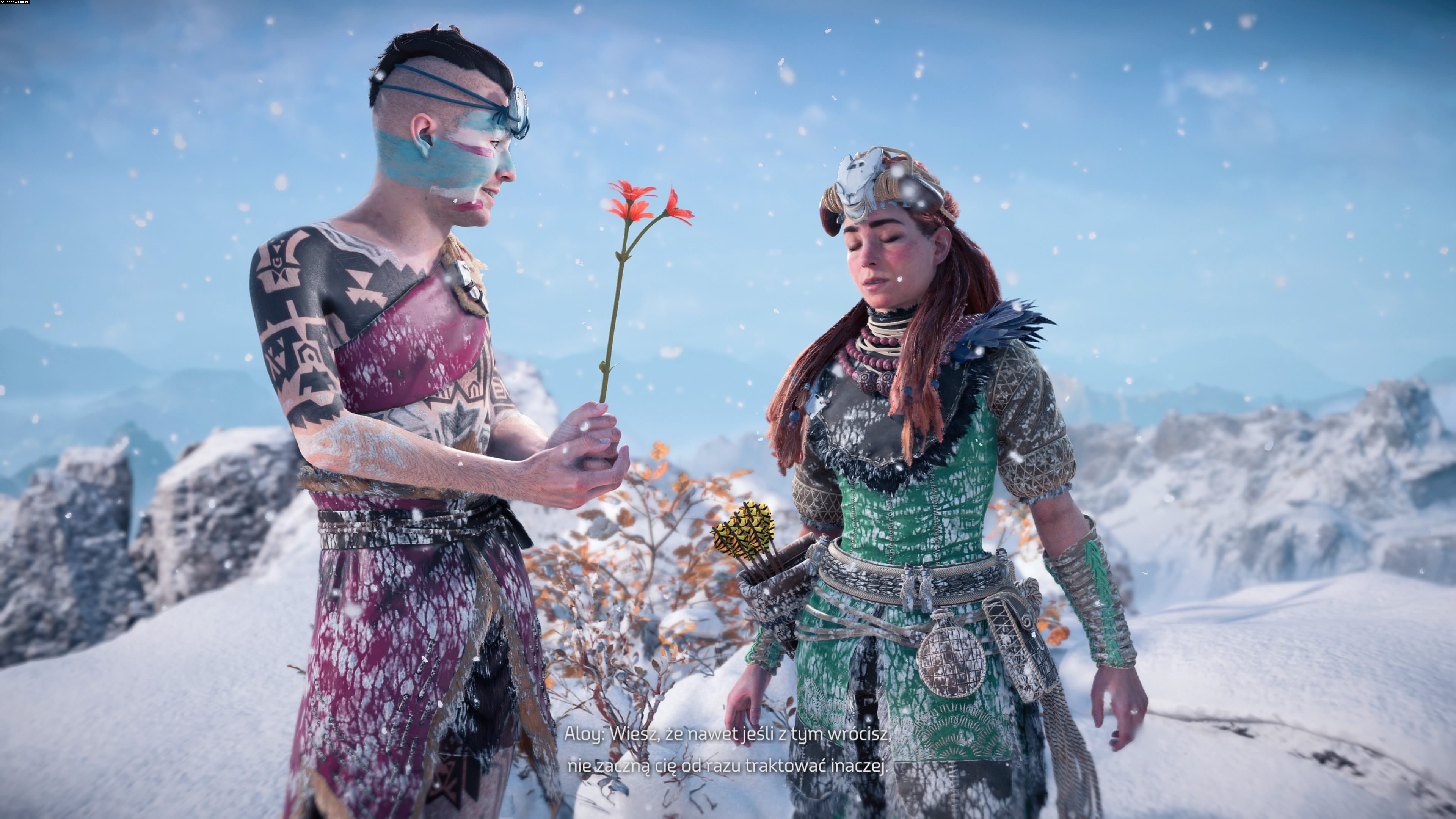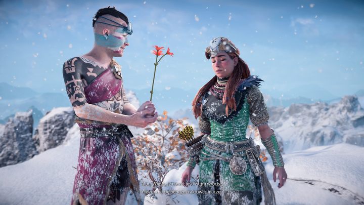 Młodzian na screenie wcale nie wręcza Aloy tego kwiatka. To trudno dostępna roślina, którą można znaleźć wysoko w górach. Zdobywając ją, młodzi Tenakthowie z Klanu Niebios pokazują, że są godni zostać prawdziwymi wojownikami.