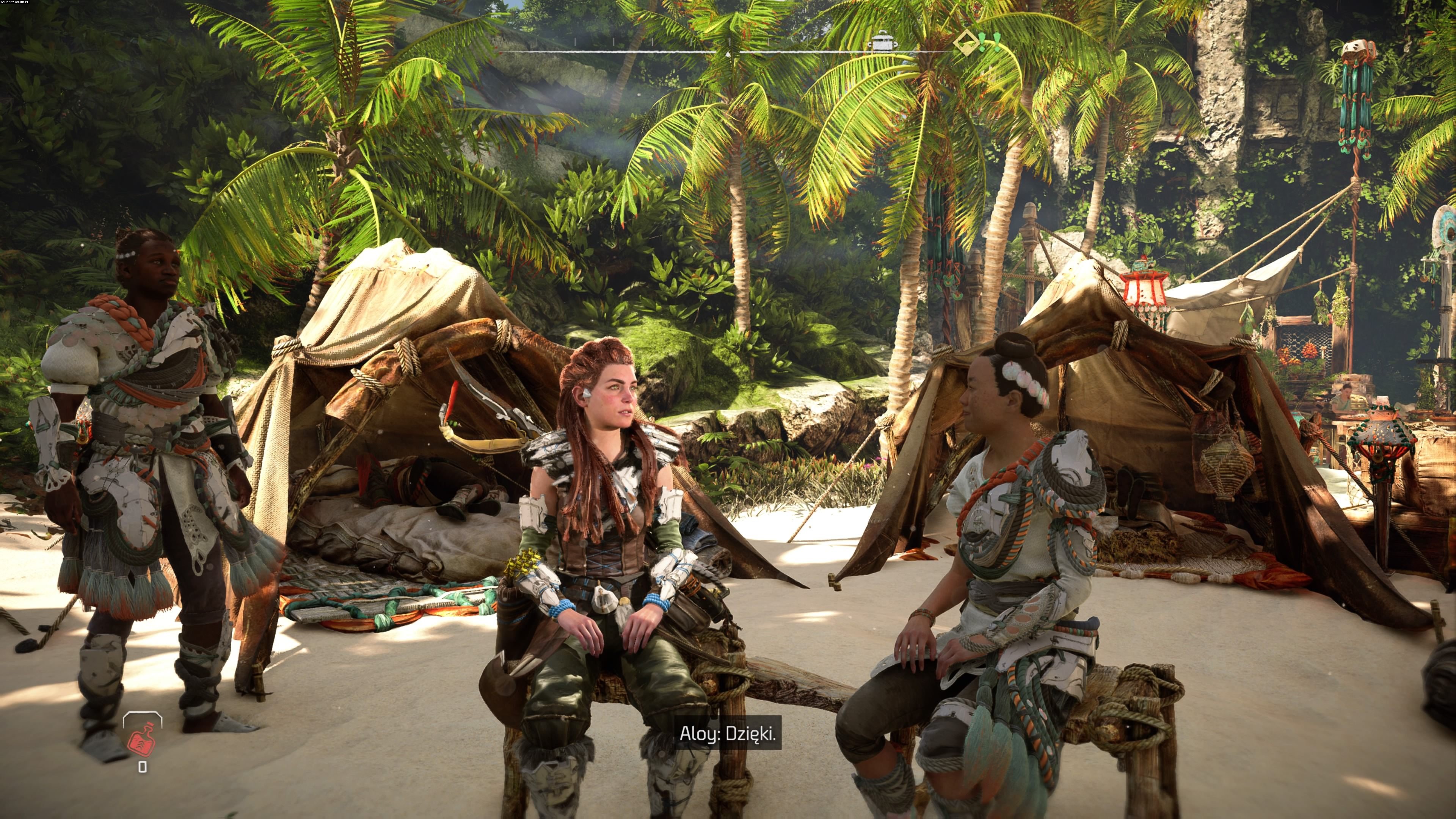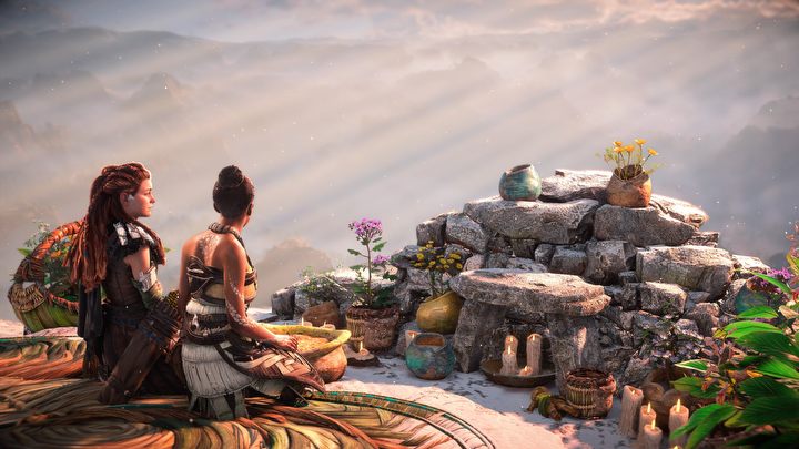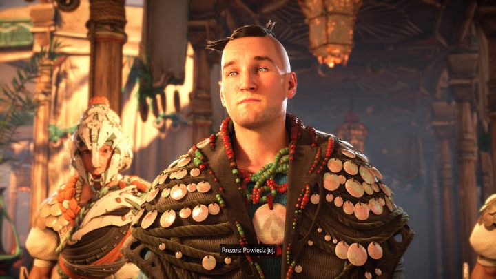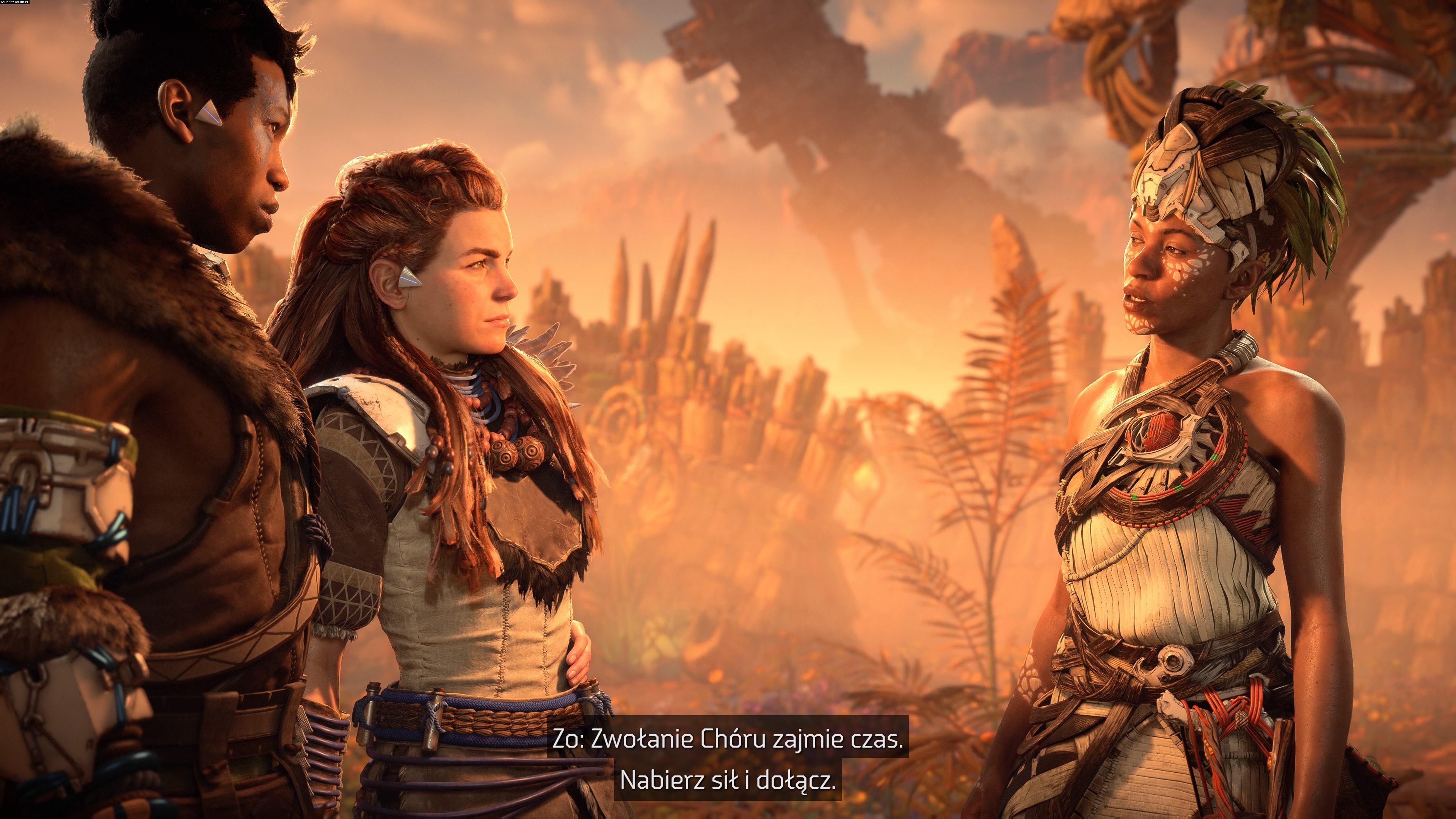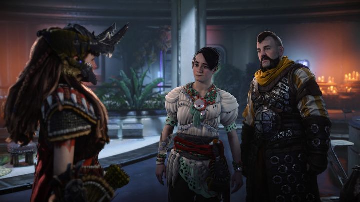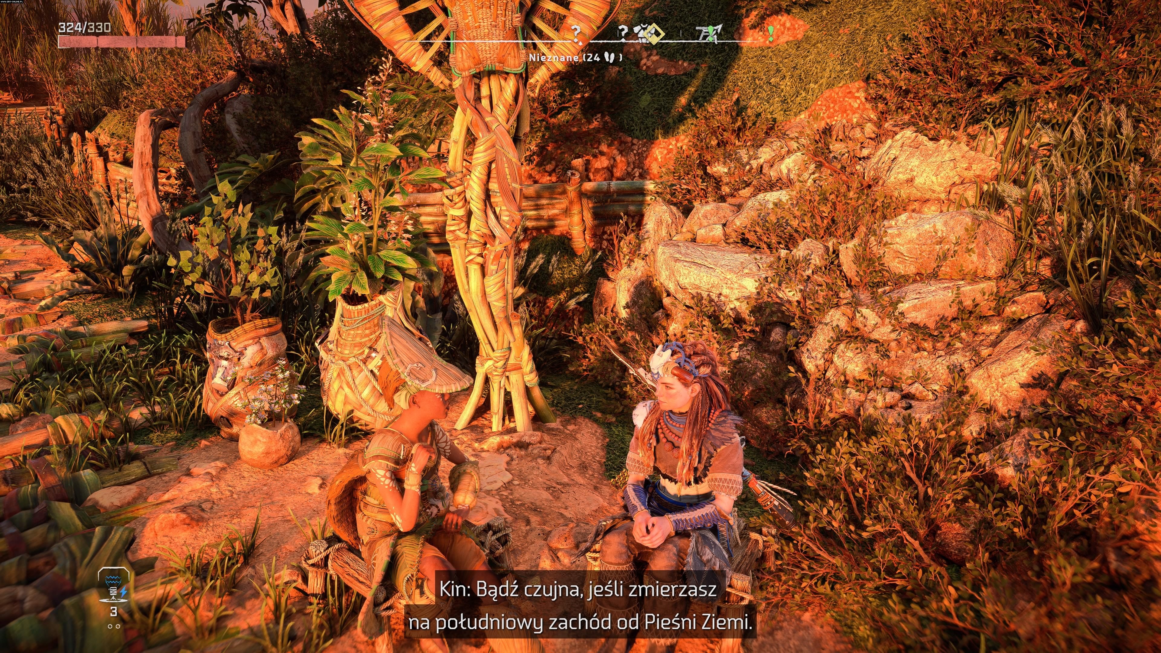 W wielu miejscach w świecie gry możemy spotkać różne osoby, które zagadnięte zdradzą nam to i owo – gdzie jest wrogi obóz albo w jakim miejscu grasuje groźna maszyna. Na screenie Aloy rozmawia z Kin (z lewej), która ma cudowne roślinne nakrycie głowy.