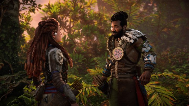 Varl i Aloy na początku przygody w „dwójce” – oboje w klasycznym rynsztunku plemienia Nora. W tle widać roślinność, którą niszczy rdza – nieznana choroba mogąca zagrozić całej ludzkości. To jeden z powodów, dla których Aloy wyrusza na „zakazany zachód”.