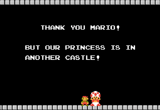 Czas na odrobinę melancholii. Przed Wami prawdopodobnie pierwsza traumatyczna sytuacja, na którą natrafiliście przy zetknięciu z grami wideo (zakładając oczywiście, że nie zaczęliście przygody z grami od Gears of War). Będąc małym, naiwnym berbeciem przeszliśmy pierwszy świat w Mario Bros., skopaliśmy skorupę pierwszemu fałszywemu Bowserowi i liczyliśmy na obiecaną nagrodę w postaci gorącego całusa od księżniczki Peach. „Przeszliśmy grę, jesteśmy kozakami, będzie czym się chwalić przed kumplami na trzepaku!” – myśleliście zapewne. A tu klops! Zamiast uśmiechniętej blondynki powitał nas człowiek-grzyb, oficjalnie dziękując za wykonaną robotę i oznajmiając, że „księżniczka znajduje się w innym zamku”. Sądziliście, że to Wasz szczęśliwy dzień? Przed Wami jeszcze dziesiątki podobnych rozczarowań, zanim w końcu zrozumiecie, że jesteście tylko zwykłym pionkiem w nieuczciwej grze. Kwestia muchomorka stała się na tyle kultowa, że wykorzystywano ją później w kolejnych produkcjach z hydraulikiem w roli głównej, m.in. w Super Mario Bros. 3, gdzie pod sam koniec gry wypowiedziała ją sama księżniczka, doprowadzając do zawału większość grających. „Tylko żartowałam!” – wyjaśniła po chwili roześmiana dziewczyna. Szkoda tylko, że część graczy była już wówczas w drodze na ostry dyżur. Aż dziwne, że po takich srogich zagrywkach Nintendo jeszcze istnieje…