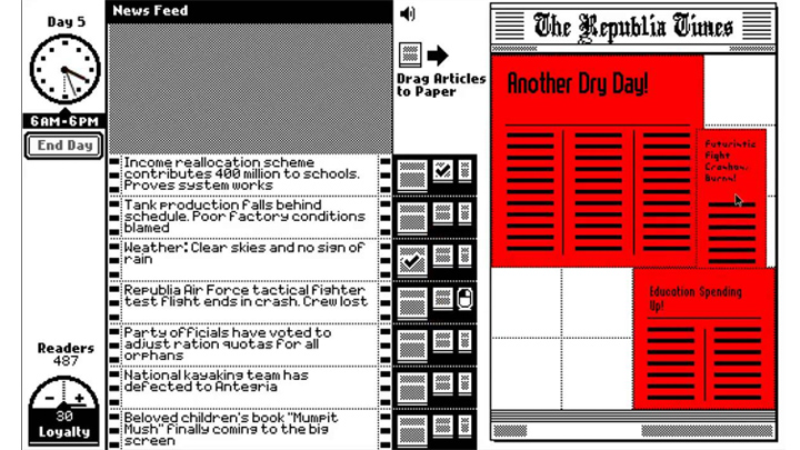Lucas Pope kojarzony jest głównie z kultowym Papers, Please, ale przed tym komercyjnym przebojem autor opracował całą serię eksperymentalnych darmowych gier. Najciekawszą z nich było The Republia Times. Produkcja opiera się na nietypowym pomyśle. Wcielamy się bowiem w redaktora naczelnego najpoczytniejszego dziennika w fikcyjnej komunistycznej republice Arstotzka. Sytuacja w kraju jest zła – niedawno stłumiono rebelię, a naród klepie biedę. Totalitarna władza potrzebuje nas, by uspokoić społeczne nastroje i zapobiec kolejnej próbie obalenia systemu.