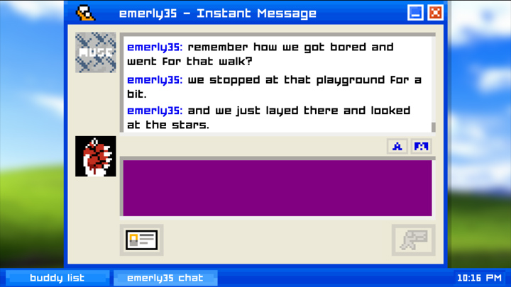 Produkcja ta świetnie symuluje niezręczne konwersacje między dwójką młodych ludzi, a stylistyka komunikatora i odwołania do popkultury sprzed kilkunastu lat tylko dodają całości autentyzmu. Emily is Away to unikatowe doświadczenie, które powinno zainteresować osoby szukające nietypowych gier.