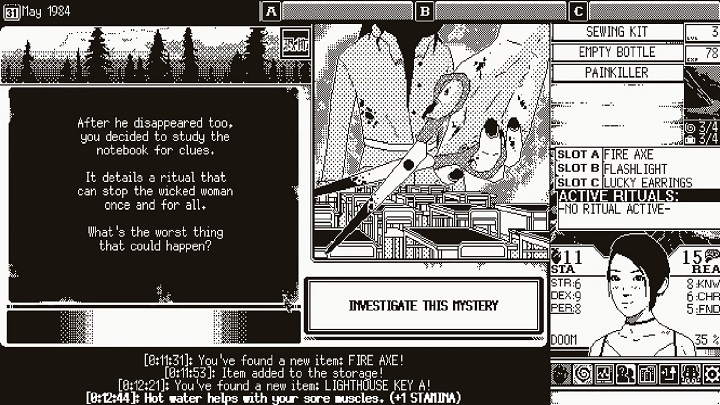 W przypadku World of Horror nie można zacząć inaczej jak tylko od niezwykle oryginalnego stylu grafiki. Ta jest jednobitowa, co w praktyce oznacza, że w jednym momencie wyświetlane są tylko dwa kolory. Twórca przygotował kilka kombinacji do wyboru, jednak najbardziej klimatyczna wydaje się czarno-biała – w końcu mamy do czynienia z horrorem. Uzupełnieniem oszczędnej oprawy wizualnej jest jednobitowa muzyka.