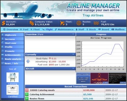Ostatnią produkcją, o której chciałbym wspomnieć, jest niecodzienny jak na facebookowe trendy tytuł umożliwiający uruchomienie własnej linii lotniczej. Airline Manager w kręgach zainteresowanych tematem jest w ostatnim czasie grą wzbudzająca całkiem sporo emocji. Sam, muszę się przyznać, nie interesowałem się dotąd lotnictwem, ale przy dziele firmy Xombat Development zabawiłem parę dni. Najogólniej rzecz biorąc, cała sprawa sprowadza się do nadania naszej linii wyszukanej nazwy, wybrania trasy i przypisania jej do jednego z posiadanych samolotów (na początku w hangarze mamy tylko Boeinga 737-800). Następnie, w miarę zarabiania pieniędzy, uzyskujemy możliwość nabywania kolejnych maszyn oraz wysyłania ich w coraz ciekawsze regiony świata – oczywiście przy wzięciu pod uwagę zasięgu danego samolotu. Tych ostatnich ujęto w grze całe setki, więc każdy fan lotnictwa będzie zadowolony. Podobnie zresztą, jak i miast, pomiędzy którymi można latać (wraz z ujęciem podstawowych informacji na temat lotnisk). Pod tym względem mamy do czynienia z naprawdę olbrzymią bazą danych.