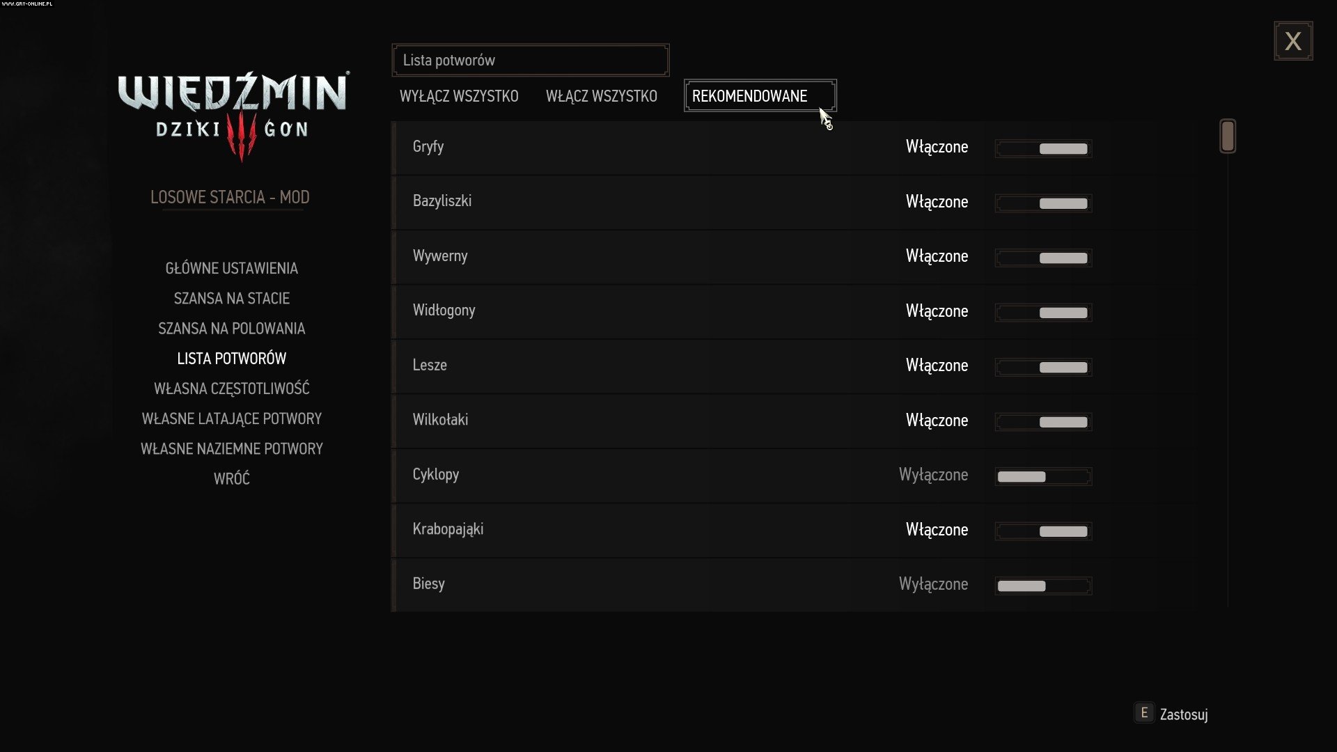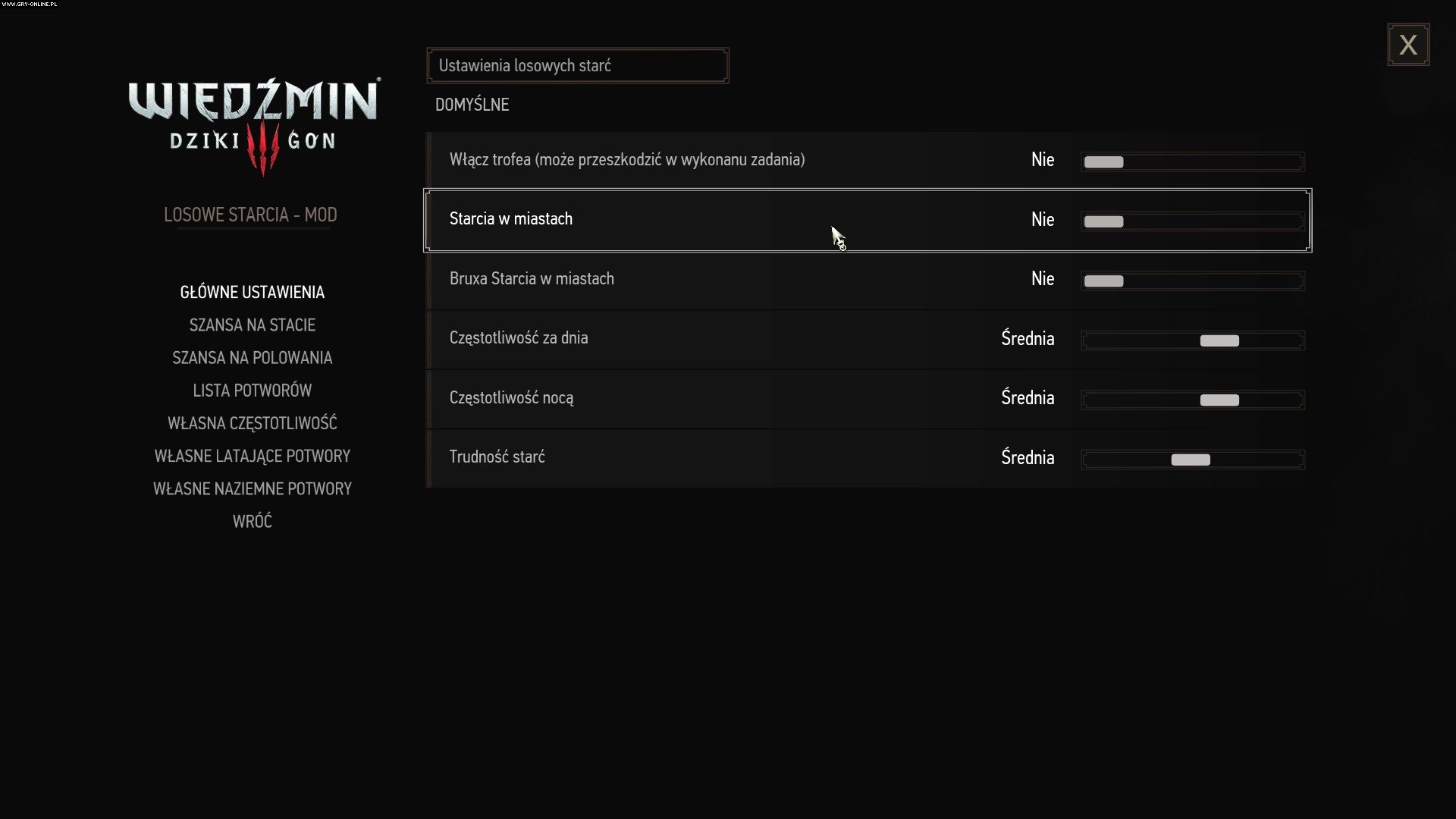 Choć założenia wydają się dość banalne, twórca modyfikacji podszedł do sprawy bardzo rzetelnie. W menu konfiguracji znalazło się mnóstwo opcji dotyczących owych losowych spotkań – można własnoręcznie ustalić częstotliwość starć z różnymi typami przeciwników (potwory naziemne i latające, ludzie, Dziki Gon), i to odrębnie dla dnia i nocy. Ponadto nic nie stoi na przeszkodzie, by wyłączyć ataki w miastach czy też umożliwić sobie zdobywanie trofeów na spotkanych w ten sposób wrogach. Ba, da się nawet wybrać z długiej listy, które gatunki potworów mogą napadać na Geralta. Mod uwzględnia również stworzenia z dodatku Krew i wino.