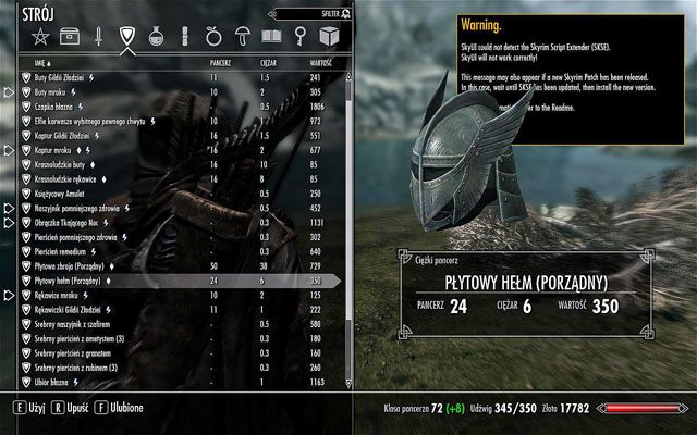 Ekwipunek i czary zostały przedstawione w formie wygodnej tabelki, po której da się szybko i intuicyjnie poruszać. Różne kategorie obiektów i zaklęć rozdzielono pomiędzy kilka zakładek, symbolizowanych przez gustowne ikonki (jest kilka schematów do wyboru). Co więcej, gracze nareszcie mogą segregować przedmioty wedle upodobania – a więc podług wagi, wartości, siły etc. Dzięki temu gra stała się dużo przyjemniejsza, a odnalezienie poszukiwanych rzeczy – znacznie prostsze (zwłaszcza że pojawiła się opcja filtrowania). Jedyną wadą może być to, że aktualna wersja SkyUI nie do końca jest kompatybilna z najnowszą łatą do Skyrima, jednak poza pojawiającym się w ekwipunku ostrzeżeniem nie zaobserwowałem żadnych innych problemów. W najbliższym czasie można spodziewać się aktualizacji programu – wówczas kłopot ten zniknie całkowicie.