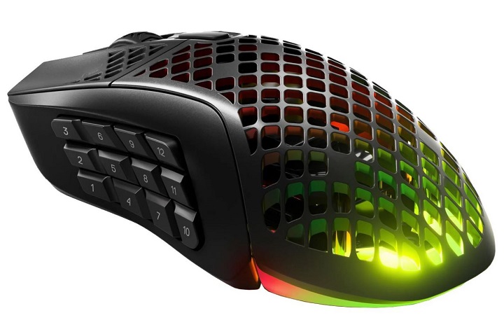 Jeśli w Waszej bezprzewodowej myszce potrzebujecie więcej przycisków umieszczonych na boku, polecamy wyższy model, tj. SteelSeries Aerox 5 Wireless (opis wersji kablowej znajdziecie w przedziale do 250 złotych). Jest jeszcze Aerox 9 oferujący już cały blok numeryczny na bocznym panelu – aż 12 przycisków. Widzicie go na powyższej fotce. Oprócz liczby dodatkowych klawiszy wszystkie trzy modele różnią się od siebie szczegółami. Najważniejsze, czyli sensor wszędzie jest taki sam.