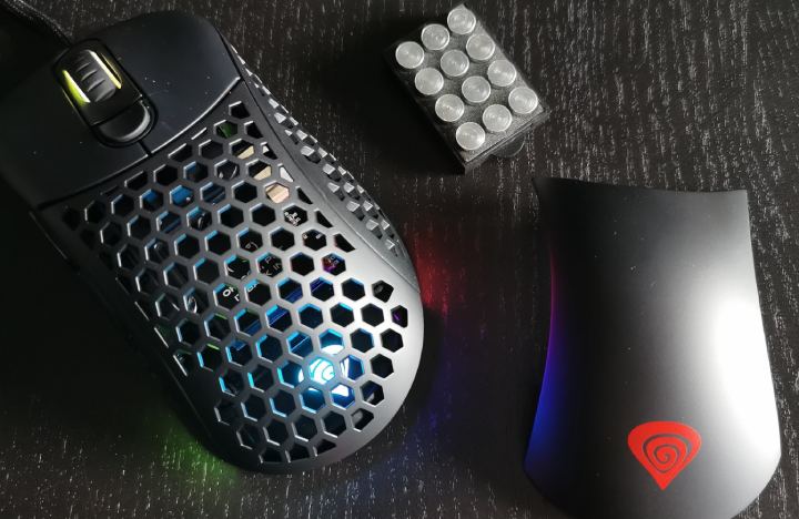 W swojej najlżejszej wersji z panelem o konstrukcji plastra miodu Genesis Xenon 800 waży mniej niż 60 g. Dla osób, które nie są przekonane do dziur w obudowie przygotowano bardziej zabudowany wariant – ważny on raptem kilka gramów więcej, zatem różnica nie jest jakoś mocno odczuwalna. Po zamontowaniu wszystkich obciążników możemy dojść do masy 78 g. – to nadal bardzo niewiele. Całość „zasila” sensor optyczny PixArt 3389, którego nie można określić inaczej niż „topowy”. Na spodzie urządzenia znajdziemy przełącznik polling rate oraz wymienne (w zestawie zapasówki) teflonowe ślizgacze.