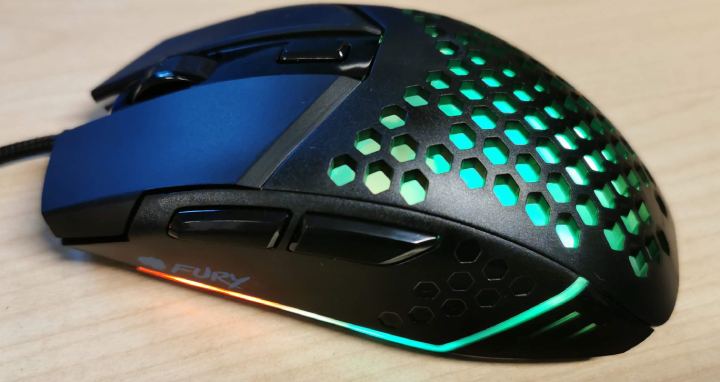 Battler polskiej marki Fury to pierwsza od dłuższego czasu myszka kosztująca ok. 40-50 zł, która zwróciła naszą uwagę jako potencjalny sprzęt do gamingu. Konstrukcja typu honeycomb pozwoliła odchudzić gryzonia do zaledwie 65 gramów. W przeciwieństwie do innych podobnych modeli, przez dziury w obudowie nie zajrzymy do środka urządzenia – „bebechy” są tu osłonięte powłoką, która przy okazji służy za nośnik dla efektów świetlnych. Możecie to zobaczyć na zdjęciu.
