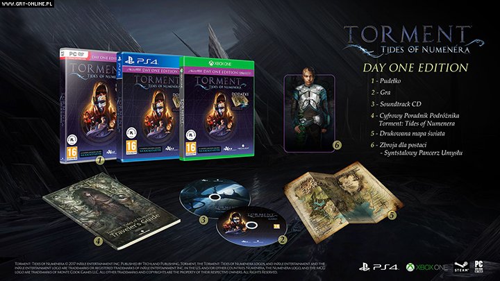 Znając dobrze losy Bezimiennego, możemy sięgnąć po duchowego spadkobiercę słynnego RPG – Torment: Tides of Numenera. To bardzo udana produkcja dla fanów turowego systemu walki i dokonywania niezliczonych wyborów moralnych, która sprostała legendzie pierwowzoru. W edycji Day One znajdziemy obowiązkową ścieżkę dźwiękową na płycie CD, mapę świata oraz kilka bonusów cyfrowych.