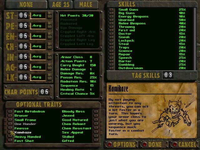 Co takiego specjalnego jest w systemie rozwoju postaci SPECIAL? Fundamentem są tu atrybuty – we wszystkich Falloutach jest ich siedem, a pierwsze litery ich nazw w angielskiej wersji gry układają się właśnie w słówko „SPECIAL” (niestety, w języku polskim wychodzi z tego „SPWCIZS”, jako że po przetłumaczeniu otrzymujemy Siłę, Percepcję, Wytrzymałość, Charyzmę, Inteligencję, Zręczność i Szczęście). Oprócz tego dostajemy kilkanaście umiejętności – odpowiadających zarówno za korzystanie z broni, jak i zdolności ogólniejszego zastosowania, np. pierwszą pomoc, retorykę, nauki ścisłe – rozwijanych przy każdym awansie. Są jeszcze cechy wybierane przy kreacji postaci, mające zarówno plusy, jak i minusy (podobny element znalazł się też w Arcanum).