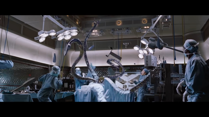 Koniec końców, dodatkowe ramiona mają zostać usunięte chirurgicznie w szpitalu, co prowadzi do pamiętnej sceny. Ramiona zaczynają „myśleć”, funkcjonować samodzielnie i nie podoba im się planowana operacja, więc przystępują do działania. Moment, w którym mechaniczne macki doktora Octaviusa (czy też już Octopusa, bo od tego momentu traci on nad sobą kontrolę, zmieniając się w owego złoczyńcę) niszczą salę szpitalną i zabijają lekarzy, jest wręcz idealnym materiałem na motyw horroru, zdecydowanie bardziej niż filmu o superbohaterach.