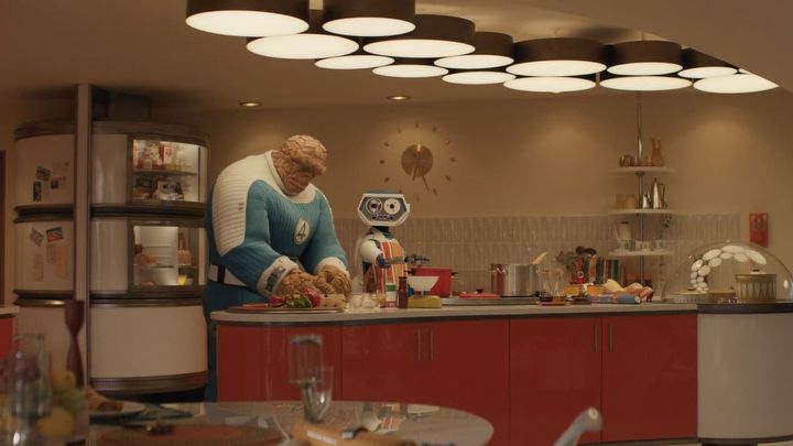 Być może Marvel wyrobił się już w dziedzinie efektów i akcji, bo Fantastyczna 4 to kolejny film, któremu w tej materii niczego nie brakuje. Udaje się zbudować trochę napięcia, walki cieszą oko, a wspomniany już kosmos nie jest co prawda na poziomie Interstellara, ale czuć jego potęgę i tajemniczość. Dodatkowo świetnie wypada stylizacja retro – poprzez ujęcia, telewizyjne programy, scenografię – która nadaje całości własny charakter. Nie obraziłbym się, gdyby twórcy poszli z tym nawet dalej, jak w serialu WandaVision, choć też domyślam się, że taki eksperyment w studiu uznano by za zbyt ryzykowny i artystyczny.