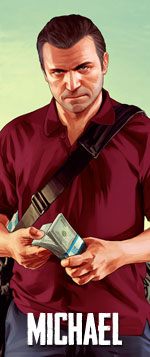 Elegancki mężczyzna około pięćdziesiątki to pierwszy protagonista gry, zamożny posiadacz dużego domu, ładnej żony Amandy i dwójki dzieci – dwudziestoletniego Jimmy’ego i jego młodszej siostry Tracey. Specjalnością Michaela są napady na banki – tym zajmował się od samego początku swej przestępczej działalności, aż stał się w tym fachu prawdziwym wirtuozem. W międzyczasie poznał i zaprzyjaźnił się z Trevorem, kolejną główną postacią w GTA V. Końcem jego przestępczej kariery miała być ugoda, jaką zawarł z FIB (odpowiednik FBI w uniwersum gry) – dzięki temu zyskał bardzo dobry status majątkowy i spokój do końca swoich dni. Niestety – kłótnia z Trevorem, coraz mniejsza tolerancja żony w stosunku do jego osoby i niemal zerowa więź z potomstwem sprawiły, że jego frustracja osiągnęła poziom krytyczny (nie pomogło mu też wielkie ego i wybuchowy charakter). Szybko kurczące się konto bankowe, uzależnienie od adrenaliny oraz świadomość, że w tym momencie swego życia ma jednocześnie wszystko i nic do stracenia, sprawiają, że Michael wraca na przestępczą ścieżkę.
