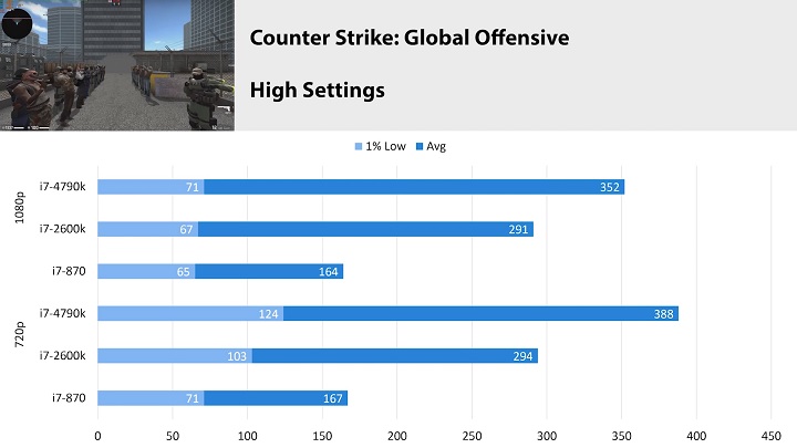 Counter Strike: Global Offensive należy do czołówki najchętniej ogrywanych FPS-ów online. To wystarczający powód, aby od niego zacząć. Udział w sieciowej rywalizacji mogą brać pecetowcy posiadający naprawdę stare podzespoły. Mówimy o modelach Intel Core pierwszej generacji. Choć z tym ostatnim można by polemizować, ale jeśli ktoś korzysta z tak starego CPU, nie ma w swojej konfiguracji mocarnej karty graficznej, a tym samym nie celuje w wydajność na poziomie większym niż stałe 60 fps. Koło takiej wartości kręci się bowiem 1% Low w przypadku i7-870. Średnia ilość klatek jest natomiast blisko 3-krotnie większa.